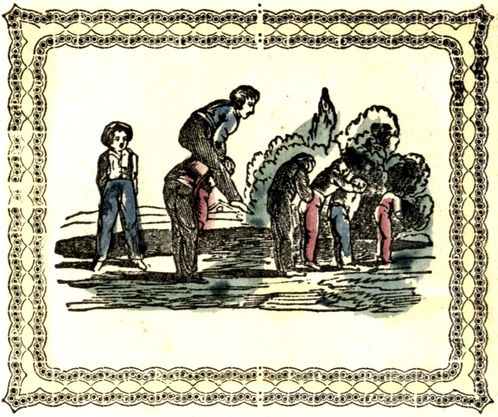 This is a pretty game, and it affords proper exercise to the body; but how often have I seen little boys after playing a while, get in a rage with each other. They are apt to be too rough when it comes their turn to leap, and of course the others do not like to be hurt, so the play is soon broken up. Boys who easily fall into the habit of quarreling, had better give up this game and indulge in others less exciting. Good children, however, can play at any harmless game, and always preserve their temper.