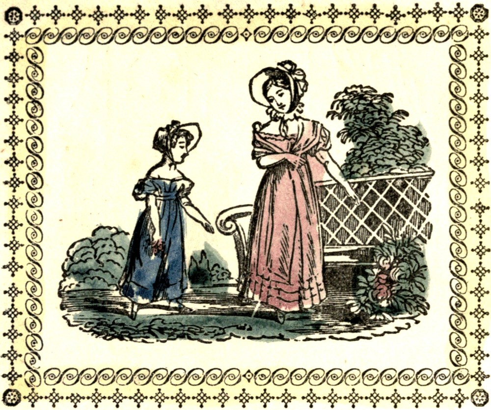 Flora loves to walk in the garden with her Mamma when all the flowers look so beautiful, and scent the air so sweetly. Do you see that seat? When the mornings are fresh and lovely in spring, Flora often takes her book and retires to it to study by herself.—And many times before other little girls have left their pillows, she has her lesson ready to recite.
