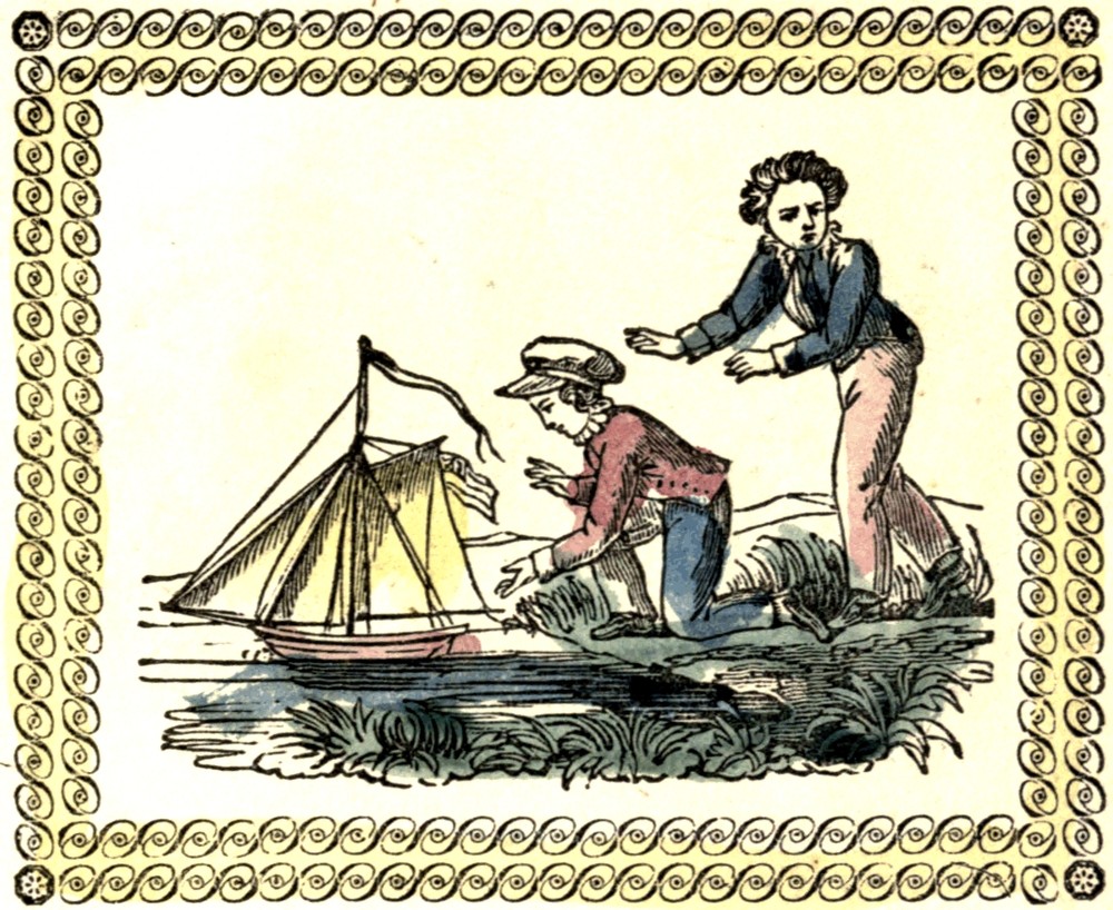 Be careful, Charles; do not go too near the water; it would be a sad affair to fall in and wet your clothes. Take care, too, not to drop the string and let your little vessel sail out beyond your reach. It would be a pity, indeed, to lose the fruits of so much labor as she has cost, in so careless a manner. Now she sits beautifully on the smooth water; the light breeze fills her sails, and her streamers are flying gaily.