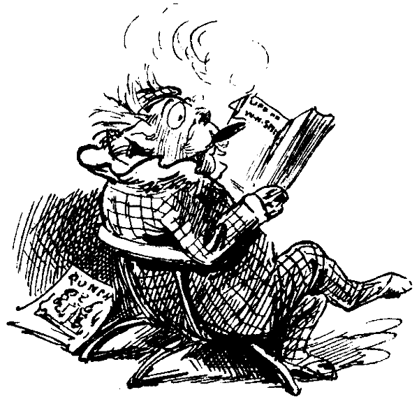 "W. A.," or "The Wisely Appreciative," went into wisely appreciative ecstasies. "Baron," he presently resumed, "you will be graciously pleased to read it." "I will recline on my sofa," returned the Baron, "and, in that position, do my level best." So saying, His Super-Excellency suited the action to the word, and, waving his hand in token that he was not to be disturbed for the space of some forty winks or more, he bent his head in silent study o'er the somewhat bulky volume. "One of the most interesting and instructive chapters in this excellently elaborated book of reference," said the Baron, some time afterwards—"a book full of 'wise saws and modern instances'—is that headed 'Religion and Rum,' whence it appears that, whatever form of worship the Natives from time to time might adopt, it always included the cult of spirits in some form or other. The title of this chapter," observed the Baron, judicially, "instead of 'Religion and Rum,' should rather have been 'Rum Religions, or Spirituous Influences.' Towards the close of the book the author still seems to be In Search of a Climate. But what sort of a climate does he seek? One to suit everybody? Why, like the distinguished individual who was 'terribly disappointed with the Atlantic,' there are people, quoted as testimony above proof by Mr. Nottage, of the Cottage, who were 'all terribly disappointed with the climate of Santa Barbara and Los Angeles.' Well, then," quoth the Baron, "try Margate and Ramsgate." The book, attractively got up, is published by the firm whose name always recalls to the Baron's verse-atile mind that delightful poem set to dulcet music yclept "Soft and Low, Soft and Low," only that the names are Samp-son Low, Low & Co., which, set to the same strain, will "do as well." "And," quoth the Baron, suddenly inspired, "what a series of songs for Publishers and Bookbinders might be written! For example, 'My Mother bids me bind my books!' 'I am inter-leaving thee in sorrow.' Cum multis aliis suggestionibus! But this is délassement. Let our toast be, 'Our noble Shelves!'—'our noble Book-shelves!'" explains the Baron, gaily; and so back to the Brown Study where, as Baron Brown Beard, he disposes of the various heads in his department, and signs himself, The Just and Generous Baron de Book-Worms.