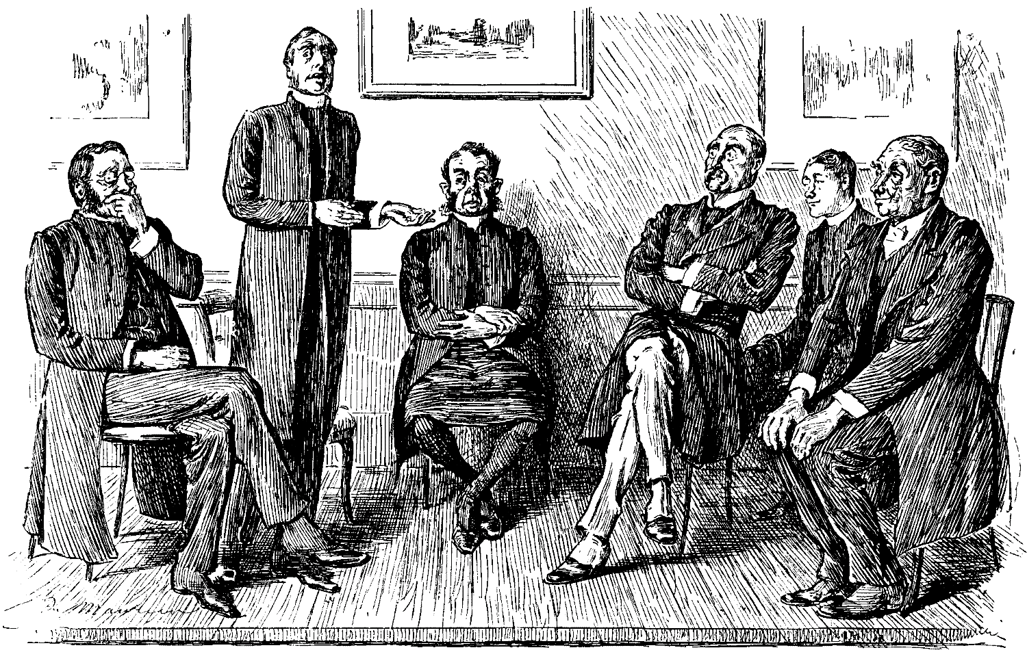 [Scene closes as the Secretary hastily seizes a slate, and automatically writes to the Ghosts a very cordial and courteously-worded invitation.