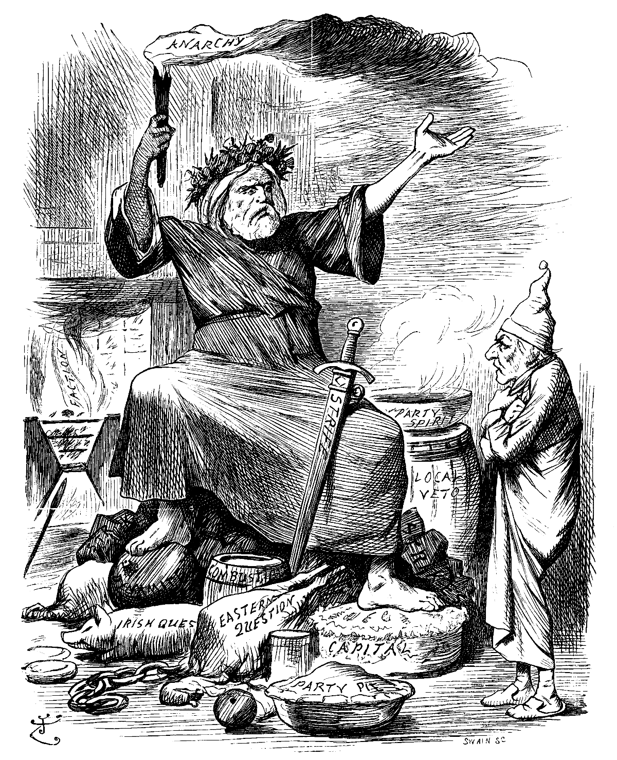 It was his own room. There was no doubt about that. But it had undergone a surprising transformation. The walls and ceiling were so hung with shamrock green and shillelagh branches that it looked a perfect Grove of Blarney. A lurid blaze, like a blue-tongued snapdragon flare, went hissing up the chimney, revealing in weird glimpses on the heated hearth and chimney tiles spectral figures of impish design and menacing gesture. Heaped up on the floor, to form a kind of throne, were Blue Books, abortive Bills, scrolls on which were inscribed endless questions and unnumbered amendments; bundles of party papers and political pamphlets; pallid sucking-pigs that seemed to demand rather opportune interment than human digestion; long wreaths of sausage-like shackles; resurrection pies of indigestible crust and full of offal scraps and tainted "block ornaments"; pudding-shaped bombs; barrels of explosives and fulminants; red hot (political) "chestnuts" of the most hackneyed partisan sort; Dead-Sea apples of the dustiest kind, savouring of sand and strife; fiery looking Ulster oranges; belated (parliamentary) pairs, and seething bowls of raw and vitriolic party spirit, that made the chamber dim, dank, and malodorous with their heady steam. In uneasy state upon this extraordinary conglomerate couch or throne, there sat an ogreish giant of pantomimic size and bogeyishly menacing expression, portentous to see; who bore a smokily-flaring torch, in shape not unlike an Anarch's beacon or Fury's bale-fire, and held it up, high up, to shed its lurid light on Sadstone, as he came peeping round the door.