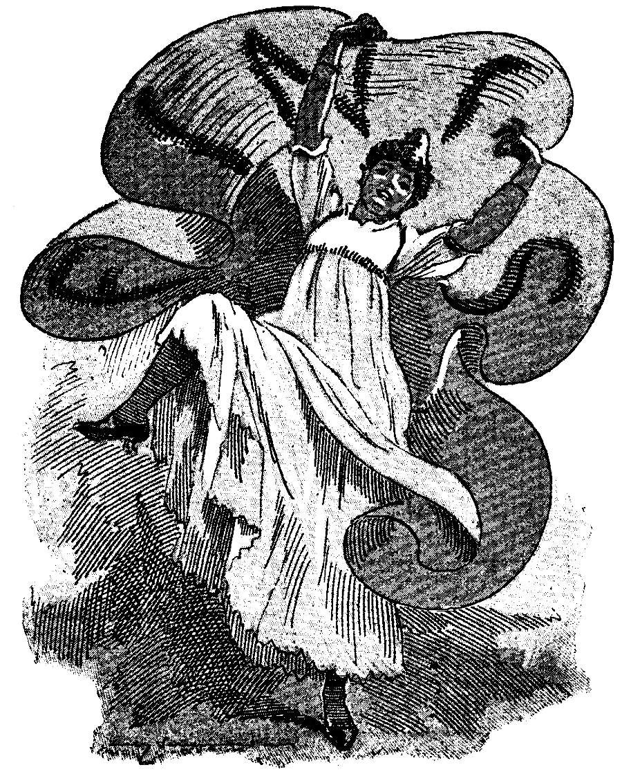 [The entr'acte is growing so prolonged that the Secretary goes behind the scenes to know the cause of the delay. He finds all confusion. The party has been increased by the presence of Mr. Stead's Spook Julia, who, having half an hour to spare, has come to protest against the "indignity" as she calls it, of fine old crusted Ghosts being expected to perform to a lot of mere modern myths. She speaks with such eloquence that she persuades them, one and all, to leave without finishing their performance and entirely without ceremony. Nothing the Secretary can say has any effect, and they all vanish, leaving "not a wrack behind," except, a slate pencil Julia has dropped in her excitement.