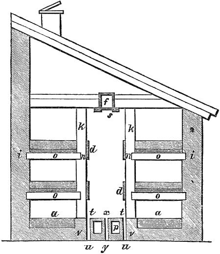 The floor may be of paving tiles, or bricks, laid on concrete: a skylight or two may be fixed in the roof, for the purpose of admitting a little light, and air when necessary. The engraving (fig. 2), shows a house of this description, 12 feet wide by 20 feet long, inside measure, but, of course, the length may be extended as circumstances may require.