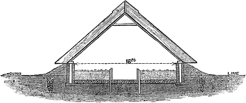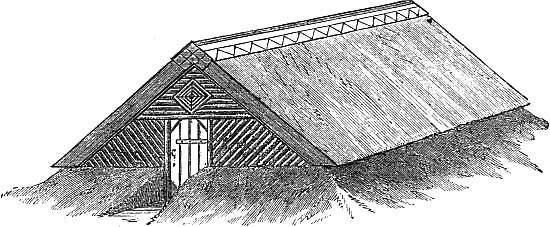 Figure 3 represents a mushroom-house suitable for people of small means, or those who cannot adopt plan No. 1. It is designed with a view to growing mushrooms during the greater part of the year, without the aid of artificial heat. To this end it is constructed in such a way as not to be affected by changes of the external[5] temperature, as will be seen by the engraving. The walls are hollow, and banked round with the soil excavated from the interior. The roof is thatched with reeds, and the ends stud-work, lined inside with boards, and outside with split larch poles: the cavity to be filled with sawdust or cut straw; a small diamond-shaped ventilator, hung on pivots, to be fixed in each end. The floor may be of concrete, or burnt clay well rammed; and the beds are retained in their place by boards nailed to good oak posts. Care should be taken to put in efficient drains, so that no stagnant damp may exist about the building.