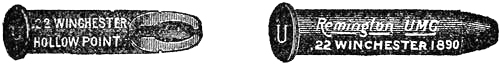 These arms, shown in Figs. 1 and 2, have solid frames, and the actions are almost identical, the cylinder swinging out to the left, on[Pg 22] a hinge, when released by a catch. The shells may then be extracted simultaneously by pushing back the extractor rod. The Smith & Wesson has an additional hinge-locking device in front of the cylinder. The Colt has an automatic safety lock between the hammer and the frame, permitting discharge only when the trigger is pulled. Apart from these features there is very little difference between these arms.