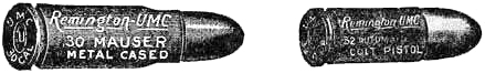Military Arms.—The revolver and the magazine pistol are used for military service. To fulfill the requirements these arms must be strong, very durable, and withstand a great amount of hard usage without becoming disabled. The effectiveness, or “stopping power,” is of prime importance. The caliber should be large, the bullet should have a blunt point, and the powder charge should be sufficiently powerful to give a penetration of at least six inches in pine. There was a tendency some years ago to reduce the caliber of military revolvers. While this resulted in increased velocity and penetration, and reduced the weight of the ammunition, it did not improve the stopping power of the arms.
