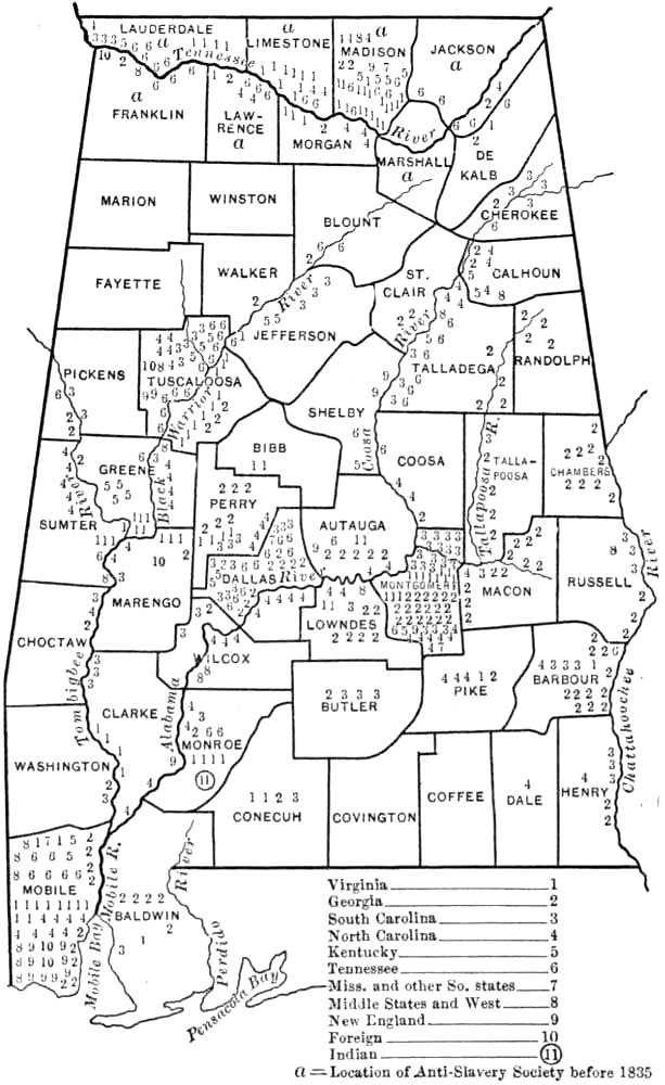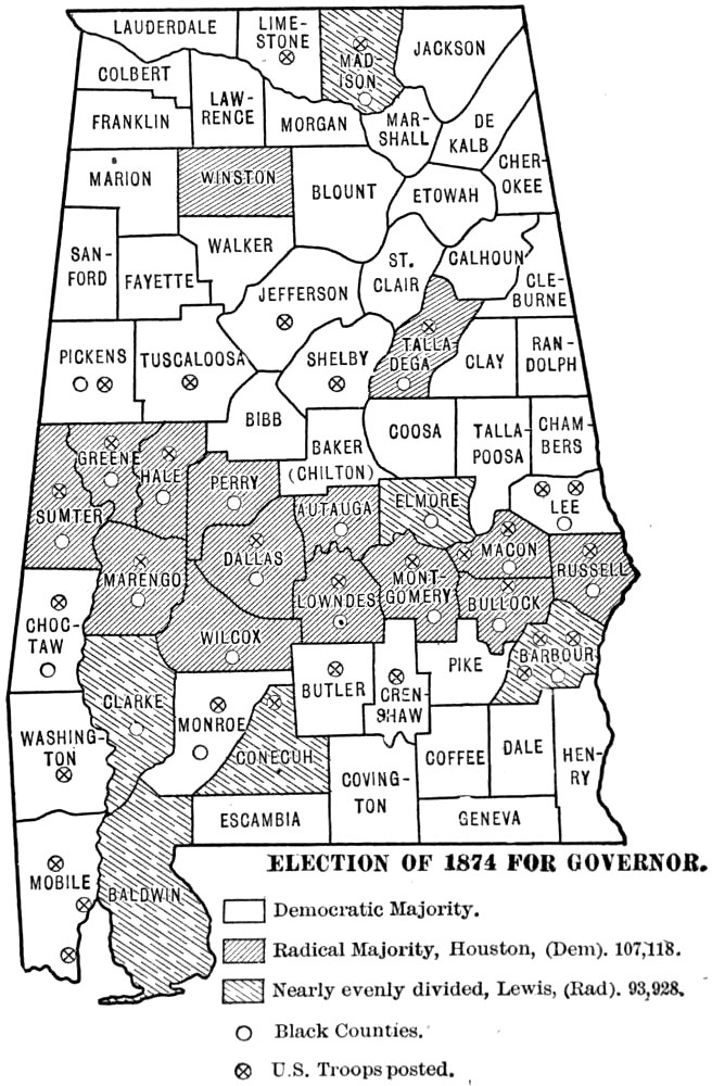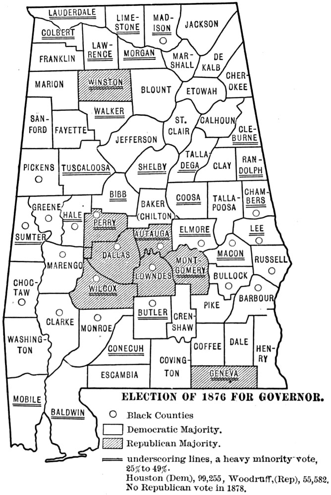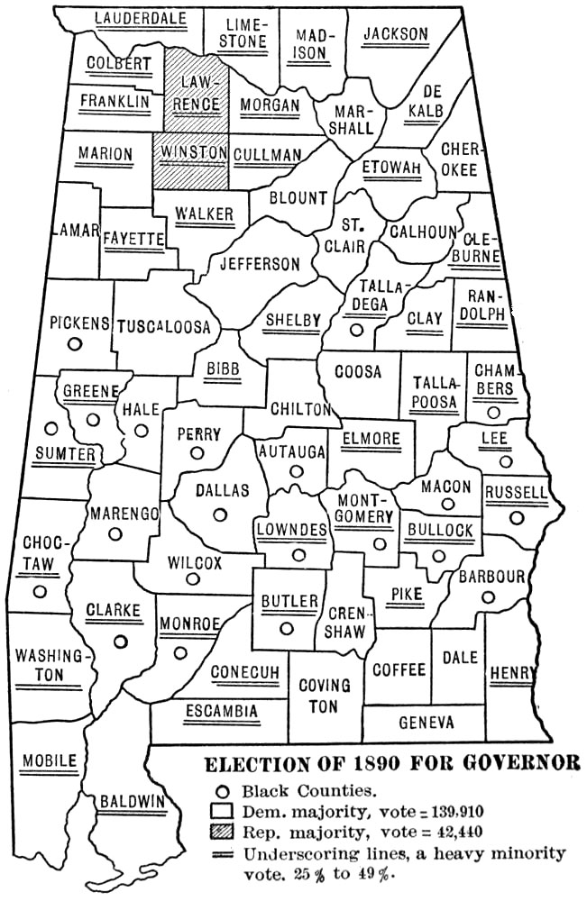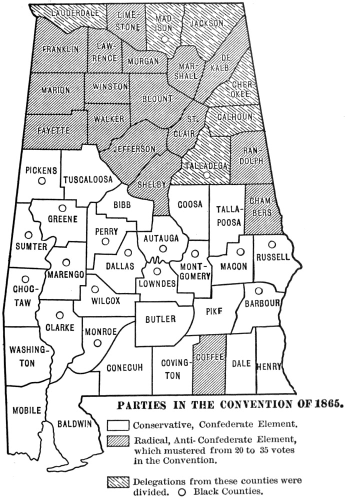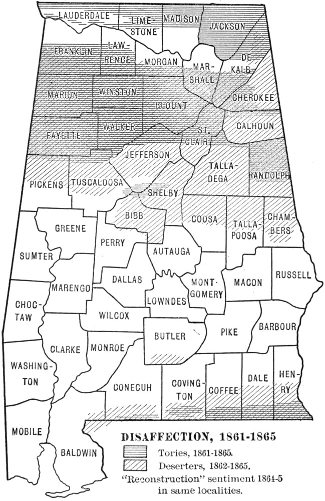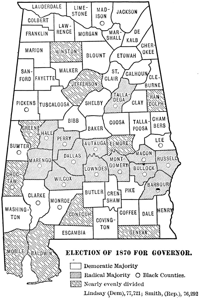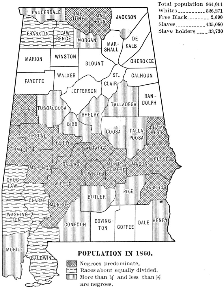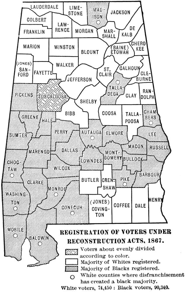 This work was begun some five years ago as a study of Reconstruction in Alabama. As the field opened it seemed to me that an account of ante-bellum conditions, social, economic, and political, and of the effect of the Civil War upon ante-bellum institutions would be indispensable to any just and comprehensive treatment of the later period. Consequently I have endeavored to describe briefly the society and the institutions that went down during Civil War and Reconstruction. Internal conditions in Alabama during the war period are discussed at length; they are important, because they influenced seriously the course of Reconstruction. Throughout the work I have sought to emphasize the social and economic problems in the general situation, and accordingly in addition to a sketch of the politics I have dwelt at some length upon the educational, religious, and industrial aspects of the period. One point in particular has been stressed throughout the whole work, viz. the fact of the segregation of the races within the state—the blacks mainly in the central counties, and the whites in the northern and the southern counties. This division of the state into “white” counties and “black” counties has almost from the beginning exercised the strongest influence upon the history of its people. The problems of white and black in the Black Belt are not always the problems of the whites and blacks of the white counties. It is hoped that the maps inserted in the text will assist in making clear this point. Perhaps it may be thought that undue space is devoted to the history of the negro during War and Reconstruction, but after all the negro, whether passive or active, was the central figure of the period.