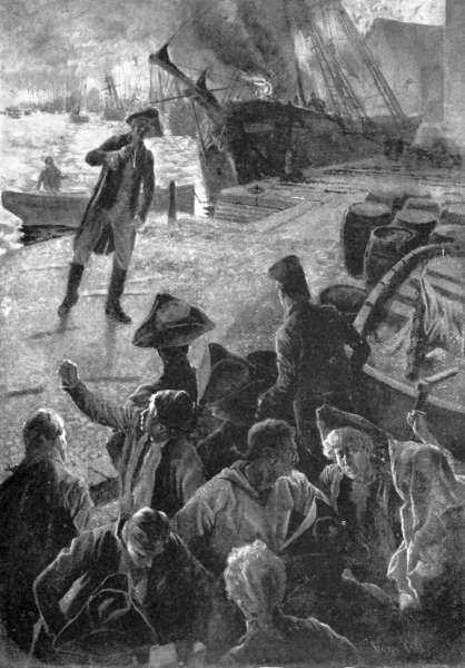 But there was no time for parley or revenge. The mob was collecting in the street they had left and soon would be down on the dock. Though Wallingford failed, Paul Jones would not. He dashed into a house on the dock, and seizing a burning brand went aboard one of the largest vessels of the fleet. He hastily pulled together some straw and hatchway gratings and soon had a roaring blaze. Then one of his men spilled a barrel of tar in the midst of it to make the destruction more sure.