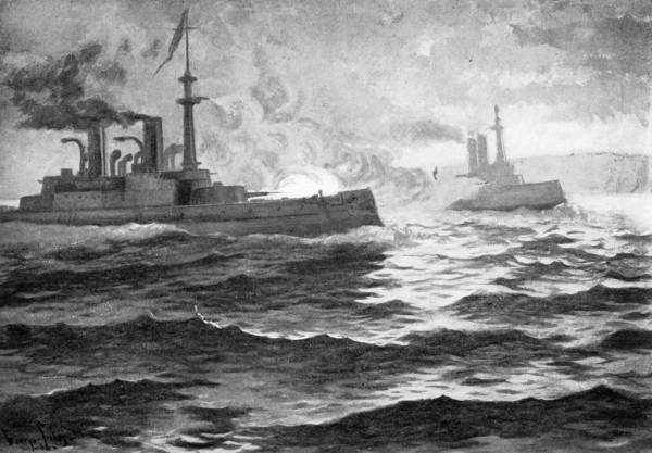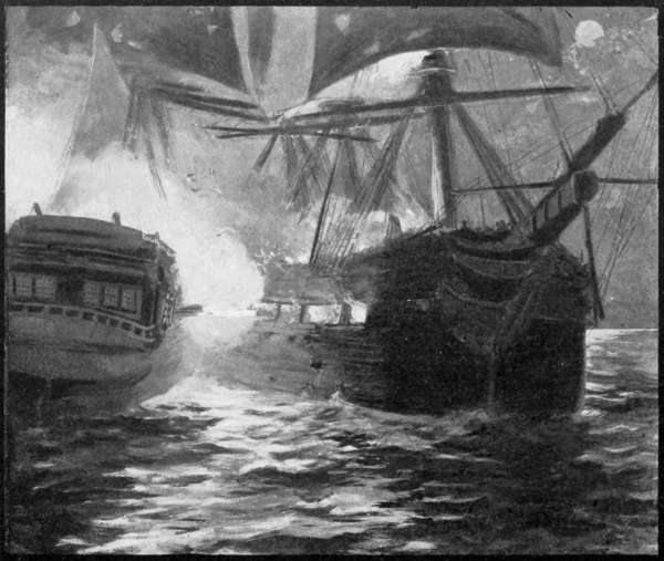 Across the oily waters came the cheery pipes of the boatswain’s mate of the “Richard” as Jones swung her up to meet her adversary, and Pearson knew his task would not be an easy one. The wind fell so light that the sun had sunk behind the light on Flamborough Head before the ships drifted up to fighting distance, and it was dark before they were ready to come to close quarters. On the “Bonhomme Richard,” Jones’s motley crew, stripped to the waist, were drawn up at the guns, peering out through the ports at the dark shadow on the starboard bow they were slowly overhauling.