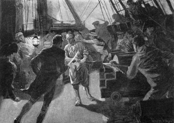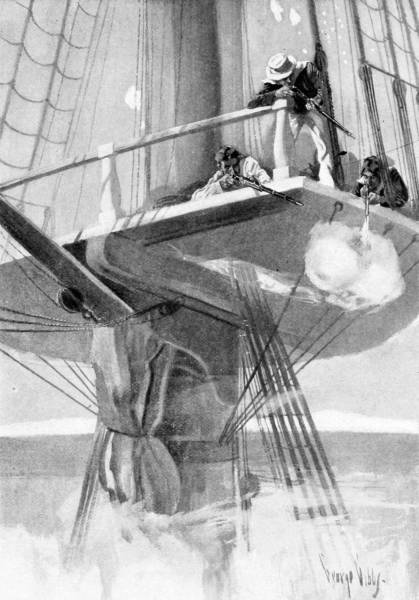 In the meanwhile Captain Burdon, finding that his boat’s crew did not return, got up his anchor, shook out his sails, and cleared ship for action. He was already suspicious, and too good a seaman to let unpreparedness play any part in his actions. There was not very much wind, and slowly the “Drake” bore down on the silent vessel which lay, sails flapping idly as she rolled, on the swell of the Irish Sea. As the afternoon drew on the wind almost failed, so that it was an hour before sunset before the “Drake” could get within speaking range. Hardly a ripple stirred the[20] surface of the glassy swells, and the stillness was ominous and oppressive.