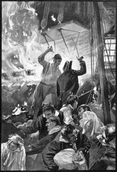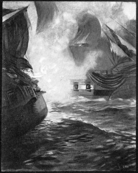 Then he turned and gave a low order to the man at the wheel, and the “Ranger” wore around so that her broadside would bear. Paul Jones always believed in striking the first blow. When they came before the wind the word was passed, and a mass of flame seemed to leap clear across the intervening water to the “Drake.” The “Ranger” shuddered with the shock and felt in a moment the crashing of the other’s broadside through her hull and rigging. The battle was on in earnest. Yard-arm to yard-arm they went, drifting down the wind, and the deep thundering of the cannonade was[21] carried over to the Irish hills, where masses of people were watching the smoke-enveloped duel. The sun sank low, touching the purple hilltops, a golden ball that shed a ruddy glow over the scene and made the spectacle seem a dream rather than reality. Still they fought on.