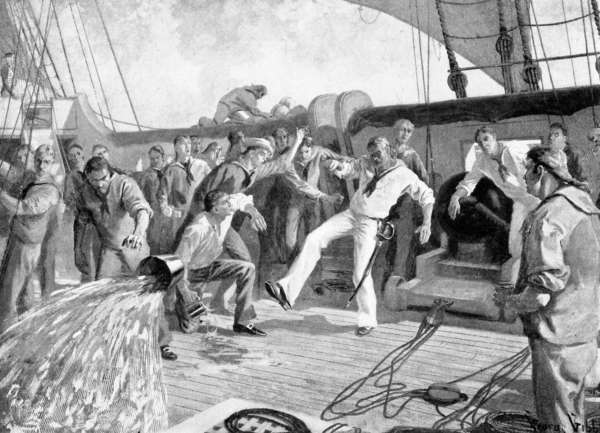 It was a glorious fight—and as fair a one as history records. The “Drake” pounded away at the “Ranger’s” hull alone, while Jones was doing all he could with his smaller pieces to cripple his enemy’s rigging. First the “Drake’s” fore-tops’l yard was cut in two. The main dropped next, and the mizzen gaff was shot away. For purposes of manœuvring, the “Drake” was useless and drifted down, her jib trailing in the water and her shrouds and rigging dragging astern. She was almost a wreck. As she heeled over on the swell, the gunners on the “Ranger” could see human blood mingling with the water of the division tubs that came from her scuppers. The first flag was shot away, but another was quickly run up to its place. In a moment that too was shot away from the hoisting halyard and fell into the water astern, where it trailed among the wreckage. But still she fought on.