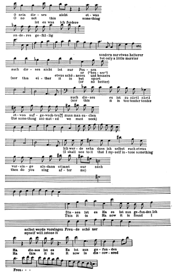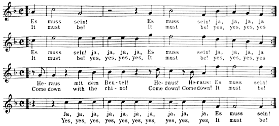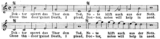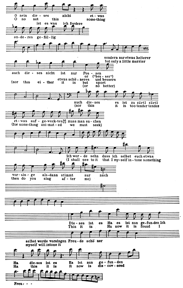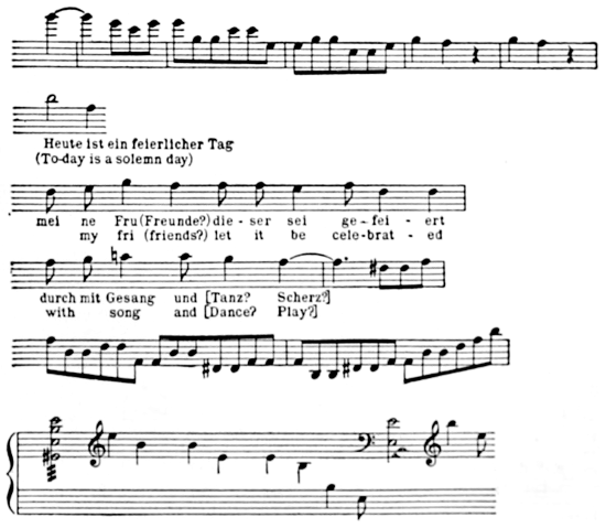 Though Karl was no longer a member of the Giannatasio household or pupil of the institute, and though there were, in consequence, fewer meetings between Beethoven and his self-sacrificing friends, their relations remained pleasant, and early in 1819 Beethoven found occasion to supplement his verbal protestations of gratitude with a deed. Nanni, the younger daughter of Giannatasio, was married on February 6, 1819, to Leopold Schmerling. When the young couple returned to the house after the ceremony they were greeted by a wedding hymn for tenor solo, men’s voices and pianoforte accompaniment. The performers were hidden in a corner of the room. When they had finished they stepped forth from their place of concealment. Beethoven was among them and he handed the manuscript of the music which he had written to words of Prof. Stein, who occupied a chair of philosophy at the University and was also tutor in the imperial household,[11] to the bride.