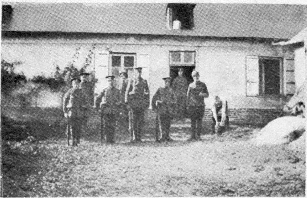 Battalion headquarters were in a cottage, and at first a battalion officers’ mess was tried in an estaminet which had a room in which a stove was riveted in the centre. In a short time, however, the difficulty of running a four company and headquarters mess in the same house became apparent, and two companies, A and B, seceded and formed a mess of their own in another café. C Company and headquarters remained in the same house, but before we had been many weeks in France the advantages of company messes became evident. Our company headquarters was in a disused and rather tumbled down house, but it had a good orchard and field behind, which we used for musketry and range finding. In return for the use of the house, we lent the owner a few men every day as a help to thresh his corn and milk his cows. There was no lack of fresh milk, eggs, potatoes, and apples. Eggs cost three sous each, milk four sous per litre.