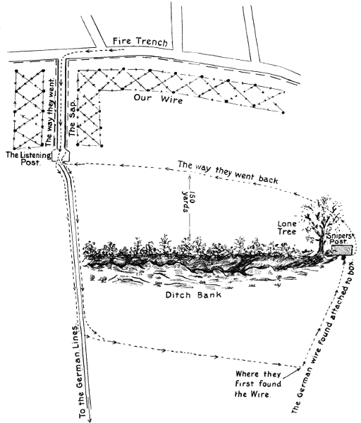 B Company of the King’s Own, to which I was attached, had its headquarters in a dugout known as “The Catacombs.” Built by the Germans, no labour had been spared to make it shellproof and comfortable. Twenty feet deep, cut out of solid chalk, it was about twenty yards long by seven feet broad. It was divided into sections for signallers, mess, and servants’ quarters, but into the wall from the mess were nooks containing beds for six officers. The whole inside of this dugout was riveted with massive planks four to six inches in thickness. There were five entrances approached by flights of steep, narrow steps. This was typical of the living dugouts in this hive of trenches. The English never built dugouts like this one in front line trenches, owing to the difficulty of getting men out of them in a hurry in case of emergency, and time after time they have proved death traps to the Germans themselves. The method of training for a battalion up for instruction is as follows:—Officers, N.C.O.’s and men are attached to their opposite numbers. Company Commander to Company Commander, Platoon Commander to Platoon Commander, sergeant to sergeant, corporal to corporal, and sentry to sentry. For three nights this proceeding is carried out, then, on the fourth night, the instructing companies withdraw to reserve, and each company takes over a sector of line on its own. Thus, bit by bit the officers and men are broken in. The first[Pg 21] night we were in the trenches was an ideal one. A full moon made things easy, and it was quite possible to get the lie of the trenches and those of the enemy. Opposite B Company the Germans were about 100 to 120 yards away; in the centre their trenches ran to within 40 yards, and on the right about 100. There were a number of “saps” formed out of what had originally been old German communication trenches. Sand bag barricades built by each side in these formed the “sap heads.” In one “sap” these barricades were about 15 feet from each other.