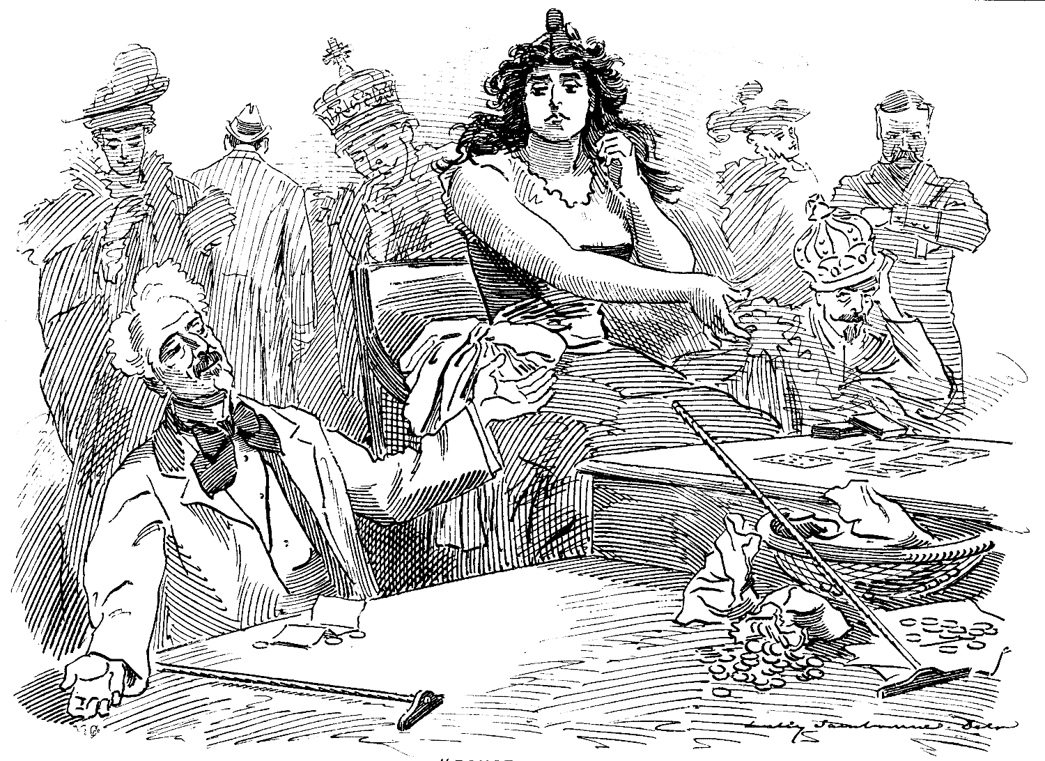 There is a great art in falling gracefully, and it is surprising what a number of interesting, complicated, and unlooked-for attitudes and figures can be thus developed. To ensure perfect confidence at the critical moment, it is as well to hire somebody, say a professional wrestler or prize-fighter, to trip you up and knock you down in all the possible methods. A mattress may be used for beginners to fall on. The more improbable your manner of tumbling, the greater success will you achieve in the eyes of the on-lookers.