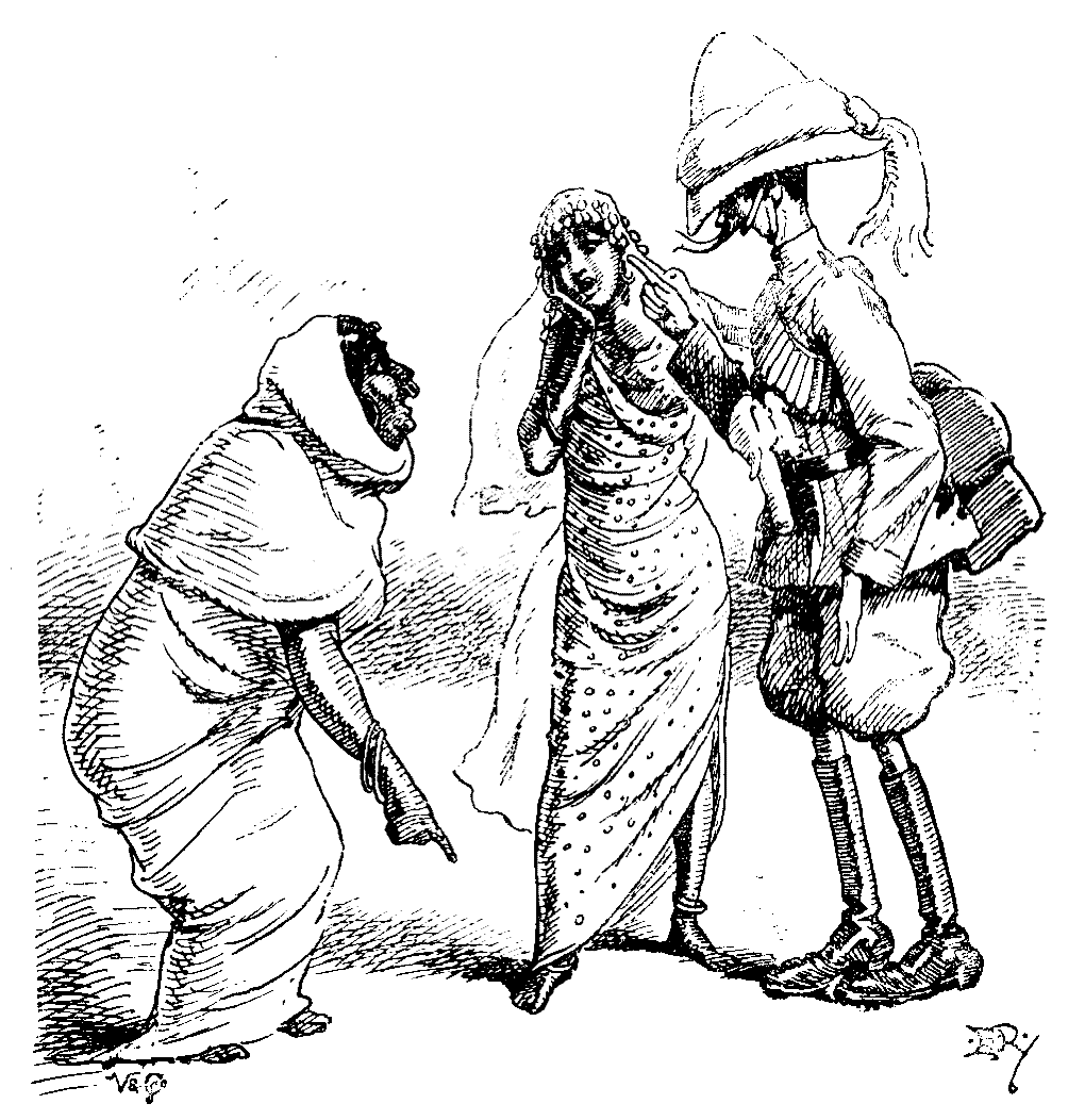 An elevation and rockery in Früyseck's back-garden, from which—but for the houses in between—an extensive view over the steamer-pier and fiord could be obtained. In front, a summer-house, covered with creepers and wild earwigs. On a bench outside, Mopsa is sitting. She has the inevitable little travelling-bag on a strap over her shoulder. Blochdrähn comes up in the dusk. He, too, has a travelling-bag, made of straw, containing professional implements, over his shoulder. He is carrying a rolled-up handbill and a small paste-pot.