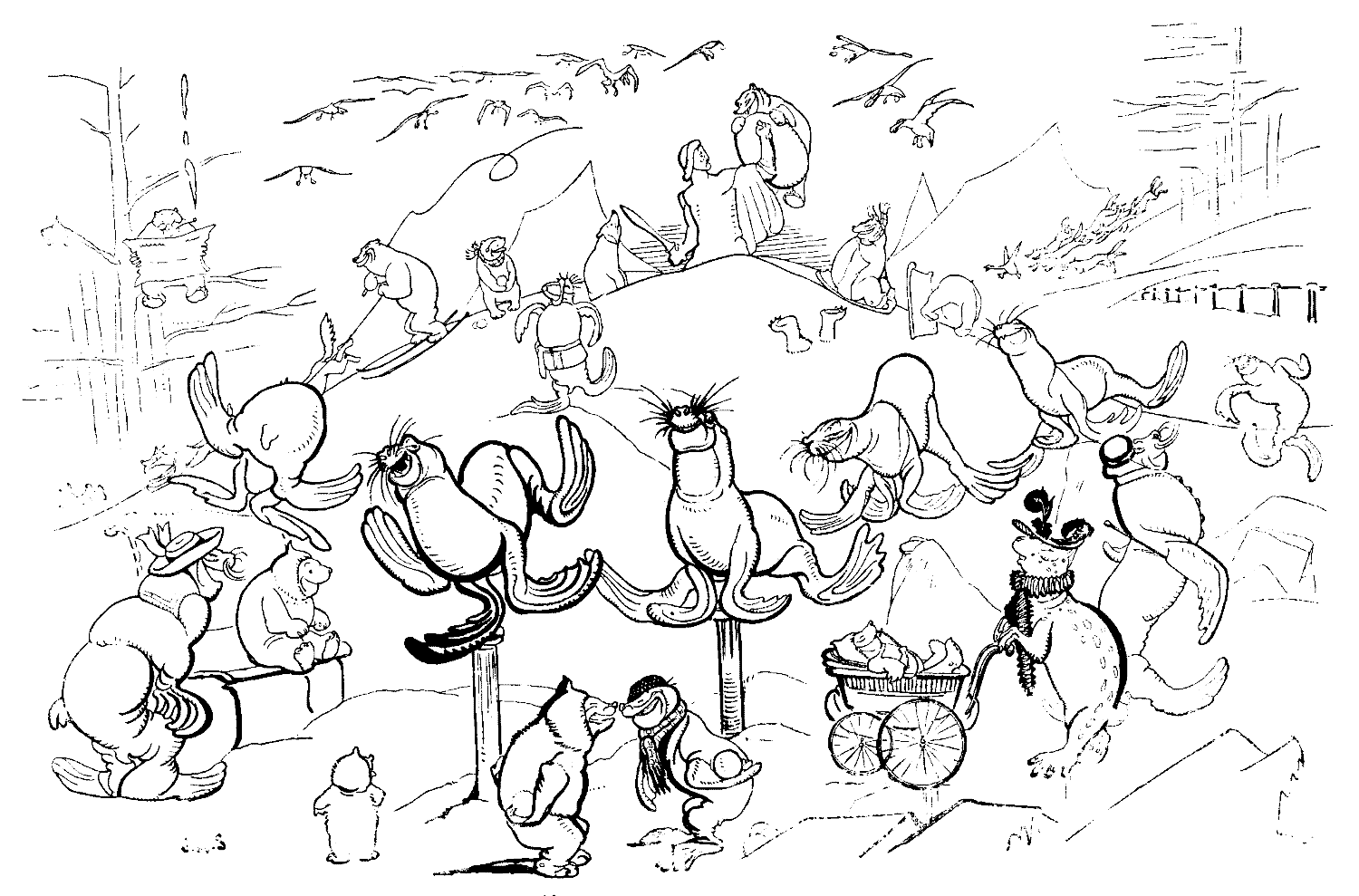 Lastly, if you prefer sliding to skating, do not slide in a top-hat and frock-coat, unless you are a member of the Skating Club, and even then it looks ostentatious. Dress appropriately in some quiet costume of kickseys and pearlies, with a feather in your hat. Wear your billycock at the back of your head, as it will break your falls. Always shout at the top of your voice.