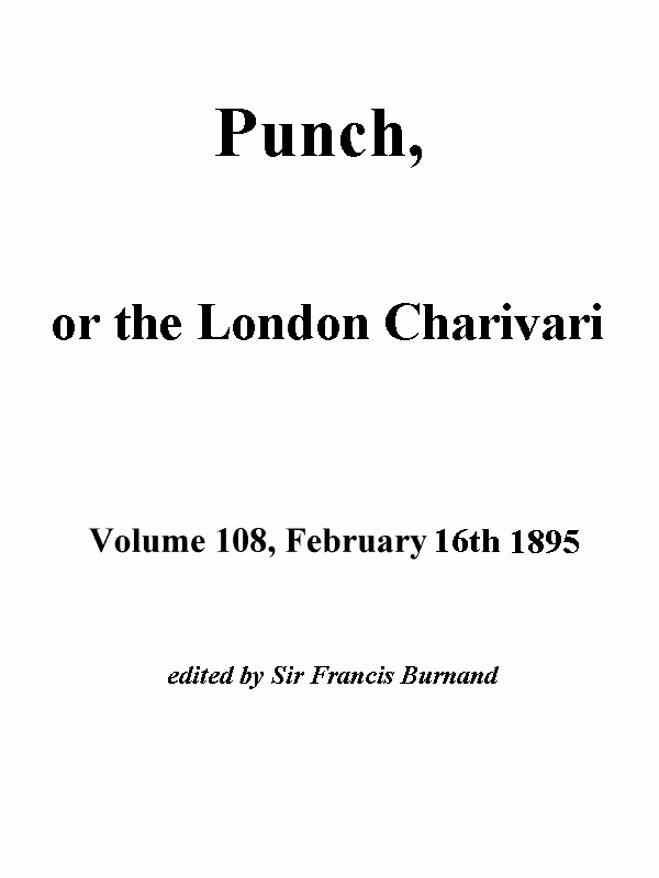The Project Gutenberg EBook of Punch, or the London Charivari, Volume 108, February 16, 1895, by Various This eBook is for the use of anyone anywhere at no cost and with almost no restrictions whatsoever. You may copy it, give it away or re-use it under the terms of the Project Gutenberg License included with this eBook or online at www.gutenberg.org Title: Punch, or the London Charivari, Volume 108, February 16, 1895 Author: Various Editor: Sir Francis Burnand Release Date: March 9, 2014 [EBook #45089] Language: English Character set encoding: ISO-8859-1 *** START OF THIS PROJECT GUTENBERG EBOOK PUNCH, CHARIVARI, FEBRUARY 16, 1895 *** Produced by Punch, or the London Charivari, Lisa Tang, Malcolm Farmer and the Online Distributed Proofreading Team at http://www.pgdp.net