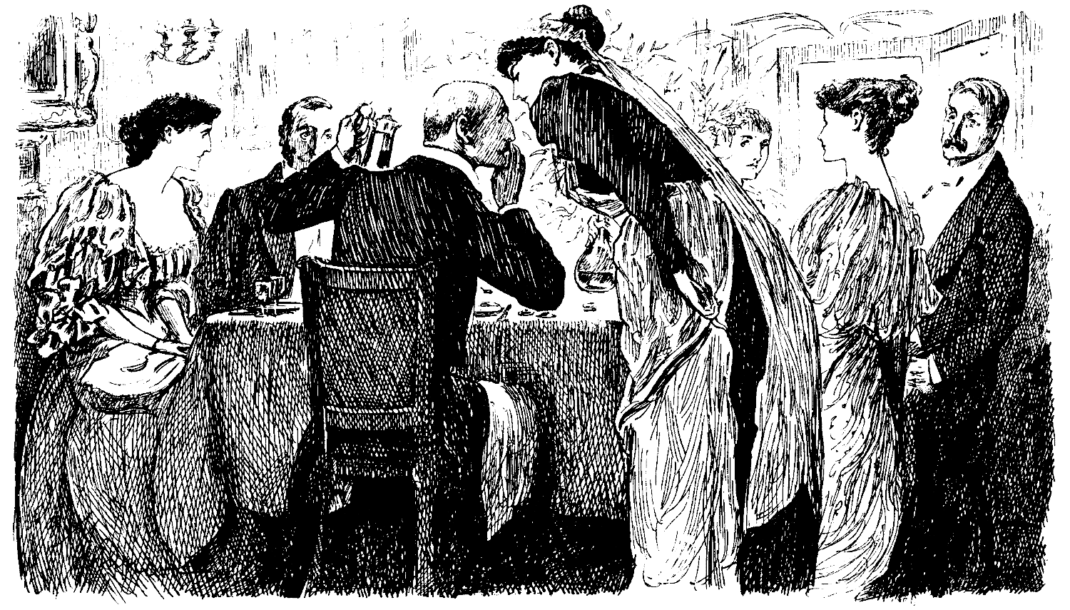 A richly-upholstered garden-room, full of art-pots and other furniture. Mrs. Spreta Früyseck stands beside the table, unpacking the traditional bag. Shortly after, Miss Mopsa Brovik enters by the door; she carries a pink parasol and a rather portly portfolio with a patent lock.