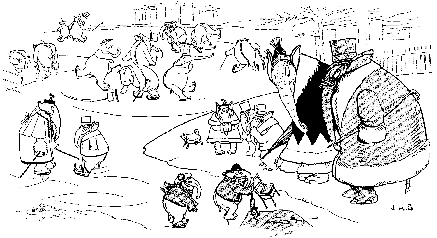 As good luck would have it, the animals had not noticed my entrance. I immediately decided what to do. Addressing my father silently in the deaf and dumb language, of which I am a master, I adjured him to stand firm for another moment or two. I could see from the expression of trustful thankfulness, which stealing over his face, robbed it of every vestige of anxiety, that he had understood my appeal. Then creeping cautiously to a cupboard, I opened it without the slightest noise and found, as I expected, a small coil of rope and a dish of Sallūns, a very tasty kind of native cake. Taking two of these, I tied one to each end of the rope, and threw it deftly so that one cake dropped under the elephant's trunk, while the other, by a stroke of good fortune, fell right into the wide open jaws of the python. The slack, as I intended, alighted gently in a running noose round the tiger's throat. What I anticipated happened. The snake, without troubling itself to discover whence the gift had come, swallowed the Sallūn with which fate had so unexpectedly provided it. In doing so it pulled the dainty at the other end slightly away from the mammoth, who, seeing it moving from him, lost no time in seizing it with his trunk and placing it, as is the wont of these animals, in his mouth. The rope was immediately pulled taut, and began to choke the tiger. His roars were awful but unavailing. Neither elephant nor python would release his hold, and in just seventy-four seconds—I took the time by my stop-watch—the beautiful striped brute was a corpse. This, however, was not all. So hard did the two living beasts struggle in their fearful tug of war that the tiger's head gradually became detached from his body and rolled away to my immoveable father's feet. What would be the result of the contest? The agony of watching was frightful. In my suspense I tried to breathe a prayer, but at the time all I could remember was the fifth proposition of the first book of Euclid, which I repeated twice over without a single mistake. Meanwhile, the two combatants, as the Sallūns went further and further down their throats and into their stomachs, approached closer and closer to one another. At last only a yard, then a foot, then six inches, then an inch separated them, until at last—Great heaven! my hair, even as I write, stands on end with unutterable horror—I saw the python open its enormous jaws to their fullest extent and swallow, yes, literally swallow the trunk, the tusks, and the vast head of the elephant. Slowly the immense pachyderm disappeared. I heard his great bones crack and shiver as inch after inch of him was remorselessly engulfed until, after three minutes and fourteen seconds, all that visibly remained of him was a little tail, which for a space waggled feebly out of the snake's mouth. Then this, too, was still. Another gulp and it was gone, and all was over.
