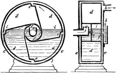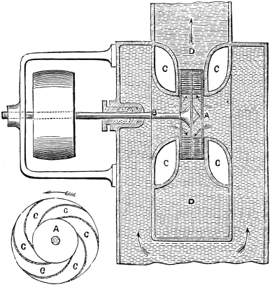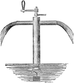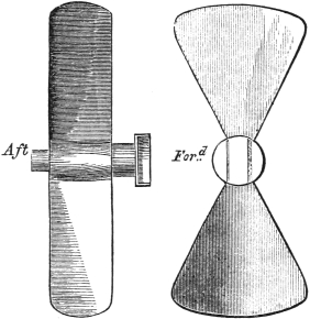 One of these is an imitation of the duck's foot, which expands when it strikes the water, and collapses when it is withdrawn. The other is the ejection of a stream of water at the stern, or on both sides of the boat, so as to produce a forward movement by reaction.13 Both these plans of propulsion seem feasible in design; but they have hitherto failed in practice. A pastor at Berne, named J. A. Genevois, has the credit of having invented the duck-feet propeller in 1755; and in 1795, six years after Mr. Miller's successful experiments, Earl Stanhope had a steam-boat built on that principle. It was so far a failure, that it was not propelled faster than three miles an hour. The other method of propulsion, though of older date, was patented in 1800 by Mr. Linnaker, who proposed to draw the water in at the head of the vessel, and eject it at the stern, and thus to obtain a double action on the water for propelling; but the plan was not found to answer.