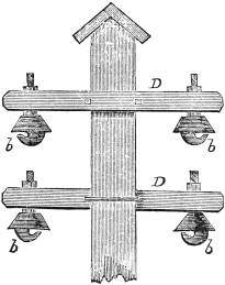 At the time of Mr. Hulls' invention, Watt had not made his improvements in the steam engine, and the kind of engine Hulls employed was similar to Newcomen's, in which the steam was condensed in the cylinder, and the piston, after being forced down by the direct pressure of the atmosphere, was drawn upwards again by a weight. The paddle, or "vanes," as he called them, were placed at the stern, between two wheels, which were turned by ropes passing over their peripheries. The alternate motion of the piston was ingeniously converted into a continuous rotary movement, by connection with other ropes attached to the piston and to the weight, the backward movement being prevented by a catch or click.