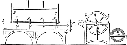 In the arrangement of the mechanism of this boat, the cylinder was placed horizontally, for the purpose of making connection between the paddle-wheel and the piston, without the working beam. The piston was supported in its position by friction wheels, and communicated motion to the paddles by a crank. The paddles were placed in the middle of the boat, near the stern; and there was a double rudder, connected together by rods which were moved by a winch at the head of the vessel.