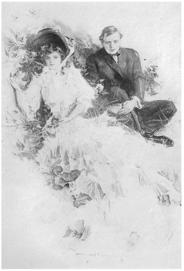 Marley found himself strolling in the yard with Lavinia Blair. The moon had not risen, but the girl’s throat and arms gleamed in the starlight; her white dress seemed to be a cloud of gauze; she floated, rather than walked, there by his side. They paused by the gate. About them were the voices of the summer night, the crickets, the katydids, far away the frogs, chirping musically. They stood a while in the silence, and then they turned, and were talking again.