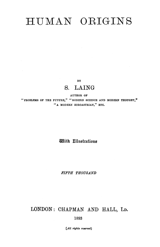 The Project Gutenberg EBook of Human Origins, by Samuel Laing This eBook is for the use of anyone anywhere at no cost and with almost no restrictions whatsoever. You may copy it, give it away or re-use it under the terms of the Project Gutenberg License included with this eBook or online at www.gutenberg.org Title: Human Origins Author: Samuel Laing Release Date: July 23, 2014 [EBook #46379] Language: English Character set encoding: ISO-8859-1 *** START OF THIS PROJECT GUTENBERG EBOOK HUMAN ORIGINS *** Produced by Marilynda Fraser-Cunliffe, Mary Akers and the Online Distributed Proofreading Team at http://www.pgdp.net (This file was produced from images generously made available by The Internet Archive)