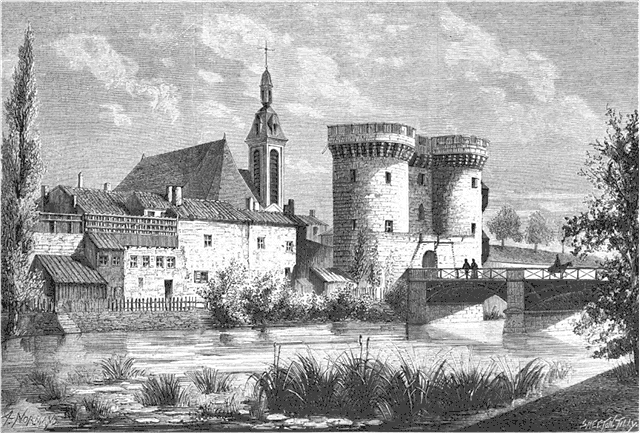 Place de guerre, Verdun est entouré de fortifications qui consistent en dix fronts bastionnés, et en une citadelle, bâtie par Vauban, séparée de la ville par l'esplanade de la Roche, et dans laquelle est englobée une partie de l'abbaye de Saint-Vannes, qui sert de caserne. L'enceinte est percée de quatre portes, dont l'une, la porte Chaussée, transformée aujourd'hui en prison militaire, mérite une mention spéciale. Nous en donnons une vue dessinée d'après nature. Elle se compose de deux grosses tours crénelées, reliées par une courtine au bas de laquelle s'ouvre la porte. On arrive à cette porte par un pont de fer à deux arches.