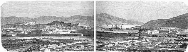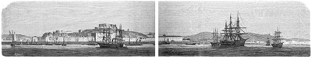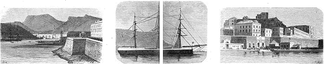 Carthagène est le dernier refuge de l'insurrection séparatiste, et espérons, ô mon Dieu! que la bête ne tardera pas à être forcée dans sa lanière, bien que la place soit formidable, comme vous en pourrez juger par mes croquis Carthagène est une des fortes villes d'Espagne et son port l'un des plus vastes de la péninsule. L'entrée en est défendue par deux hautes montagnes, sur lesquelles s'élèvent le château Caleras et le fort Saint-Julien. La position de ces deux forts est magnifique. Ce n'est qu'après avoir passé sous leur feu que l'on peut pénétrer dans l'étroit canal qui conduit au port. Ce canal est lui-même défendu par quatre autres forts situés: le fort Santa-Anna (6 canons), et la batterie Santa-Florentina (3 canons), à droite; et à gauche le fort Podadera, à double batterie, ayant environ douze canons à la batterie supérieure, et la batterie de la Navidad, non moins redoutablement armée. Avant d'arriver au port de Carthagène, on trouve à droite la petite île et la baie d'Escombrera. C'est dans cette baie que stationnent les vaisseaux anglais et français qui sont devant la ville, et auxquels sont venus se joindre ces jours derniers deux navires des États-Unis, Wabash et Wachusetts, et quatre italiens, Roma, Venezia, San-Martino et Authion. Là se trouvent également les bâtiments Almansa et la Vitoria, capturés sur les insurgés qui ont menacé d'ouvrir le feu sur la flotte anglaise si le commandant de celle-ci faisait mine de sortir lesdits bâtiments de la baie pour les livrer au gouvernement de Madrid. La frégate cuirassée la Numancia, dont je vous envoie un croquis, et qui est au pouvoir des insurgés, stationne même à l'entrée du port, se tenant avec le Mendez et le Fernando catolico, également aux insurgés, prête à parer à toutes les éventualités.