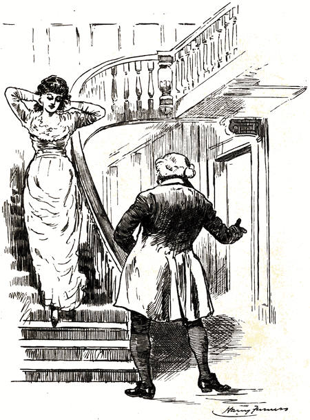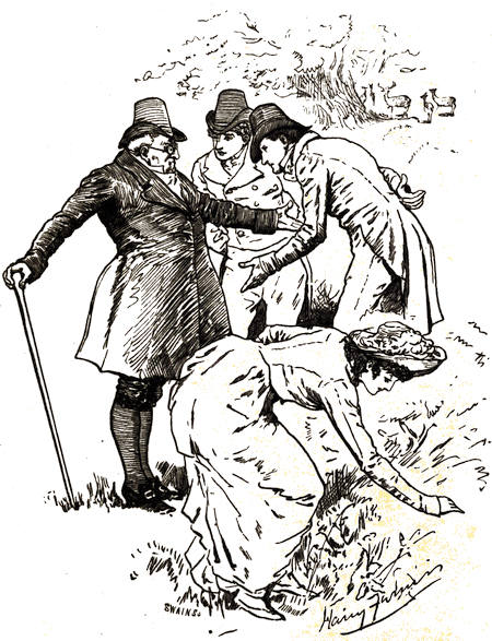 Last of the three, she tripped out of the coach, declining, with a pretty toss of her head, the assistance the younger man would have rendered her in alighting. She could trip and toss her head like any fairy. No tower of hair ‘like a porter’s knot set upon end’ had she; her dress, though to modern eyes very short-waisted, was not, as an annalist of her time has described it, ‘drawn exceeding close over stays drawn still closer;’ her movements were light and free. Her lustrous brown hair fell in natural waves from under a beaver hat turned up on the left side, and ornamented with one grey feather. A grey silk spencer indicated, under pretence of concealing—for it was[16] summer weather, and she could not have worn it for warmth—the graces of her form. Her eyes were bright and eager, and her pretty lips murmured a sigh of relief, as she touched ground, at her release from durance.