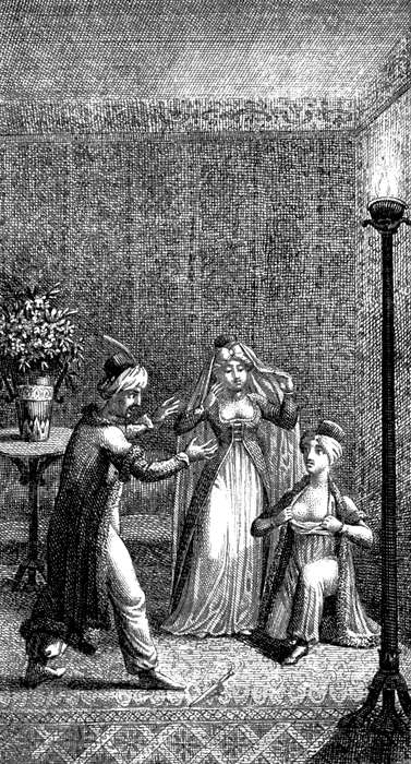 Eben aber, da der Handel abgeschlossen wurde, trat auch ein junger Franzose hinzu, wurde plötzlich von des holden Mädchens Schönheit bewegt, und fragte den Welschen mit Ungestüm, ob er sie mit hohem Vortheil ihm überlassen wollte? Nein, versetzte Jener, und so ich zehntausend Piaster gewönne. Das Mädchen blickte vielsagend nach dem Franzosen, und er begriff, daß sie sich lieber in seinen Händen befinden würde. Eine Entdeckung, die das Feuer seiner Liebe natürlich noch um so mehr anfachte.