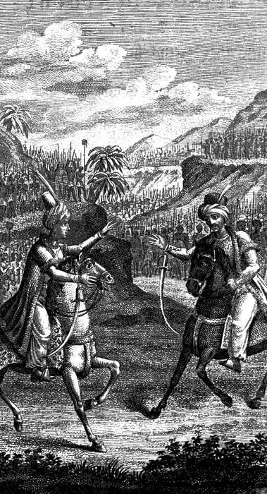 Gigi hatte aber den Offizier bemerkt, und da sie ohnehin an Kuku etwas sagen lassen wollte, so schickte sie einige Adjudanten ab, wie sie ihn umkehren sah, ihn wieder zu rufen. Jener spornte desto mehr, hatte aber den Unfall, mit dem Pferde über eine Vertiefung zu stürzen. Nun hielt man ihn an, sagte aber: er hätte nichts zu fürchten, solle nur eine Bothschaft an seinen Herrn mitnehmen.
