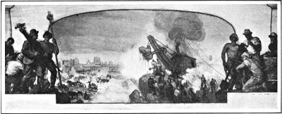 In “The Apotheosis of Pennsylvania,” below to the left are Sir Walter Raleigh, who had a grant in Pennsylvania; Henry Hudson, who discovered and sailed up the Delaware River; Captain Minuit, the explorer and navigator, and others. To the right are a pioneer and representatives of various religious sects that settled in Pennsylvania. Below these, beginning at the left, are ships on the stocks, the city troopers, General Wayne, Atkinson (the first American judge), the first provost of the University of Pennsylvania, Bishop White (the first American bishop), and others, among them Dr. Caspar Wistar, Benjamin Franklin, William Penn, and Robert Morris. At the left are Governor Curtis and Thaddeus Stevens cheering the soldiers of 1861 marching to defend the state, officered by Generals Hancock and Meade. On the right are miners and workers in steel and iron, machinery, and so forth.