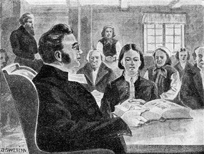 Prosten var där, förstås. Han satt längst framme vid bordet, där den stora husförhörsboken låg. Katekesen och Nya testamentet lågo där också, och de ungas blickar foro ofta hän till de där böckerna. Ty i dag skulle prosten anställa förhör med dem i deras kristendomskunskap och deras färdighet att läsa innantill. Mer än en darrade invärtes, ty prosten var en sträng man, som icke sparade på bannor och förmaningar. Men var det någon, som gjorde sin sak bra, så sparade han inte på beröm heller.