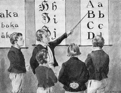 I skolan undervisades barnen efter växelundervisningsmetoden. Det vill säga, att de mera försigkomna lärjungarna fingo hjälpa till att undervisa de yngre och mindre försigkomna. Stavningen inlärdes från tabeller, som hängde på väggarna. Barnen ställde sig i en halvcirkel framför tabellen. En av de dukti[Pg 12]gaste, som kallades monitör, stod med en pekpinne i handen och pekade för de andra ord för ord, rad för rad, allt medan någon av dem stavade högt. Johan blev snart upphöjd till monitör och skötte sin pekpinne med säkerhet.