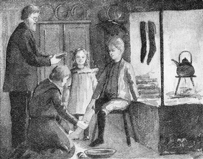 Äntligen var det slut med läsningen och förhöret i katekesen. Prosten lade ifrån sig böckerna. Men då fick hans skarpa öga syn på ett par små pysar, som höllo till borta i spiselvrån. Med stora vakna blå ögon hade de uppmärksamt följt med under hela tiden.