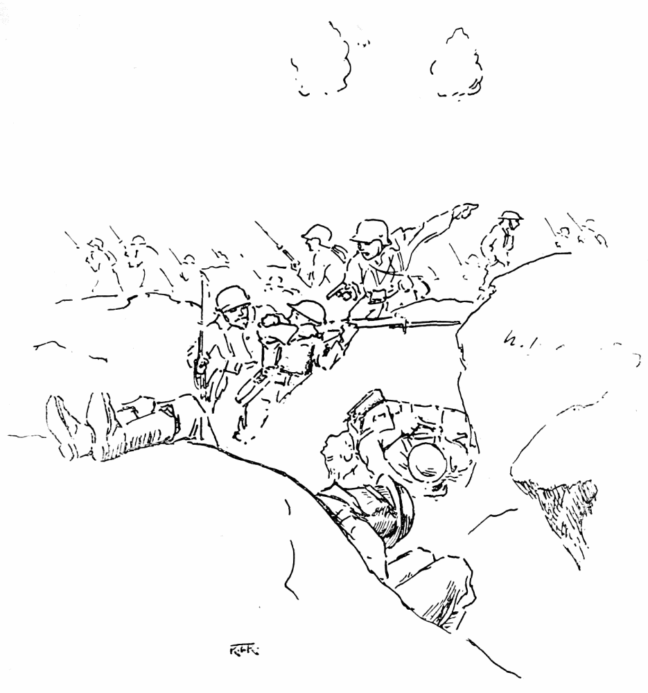 At last all the equipment of a machine-gun section had been carted away. I took one turn round the dugouts to see that no incriminating document remained. The dugout looked hospitably clean; all the delicacies of handing over had been observed, but as there would be up one to receive the relieving party, manners demanded some sort of “Salve”; and so, tearing from a notebook a sheet of paper, I scrawled across it in large letters, CHEERIOH, and pinned it over the entrance of my deserted home.