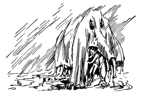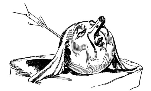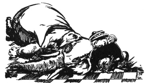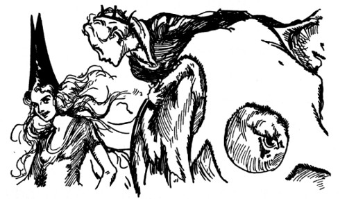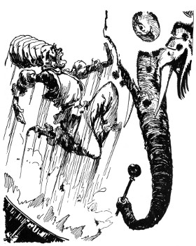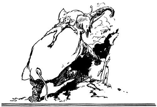 "Kaybumpo, is it?" sniffed Kayub, jerking himself with great difficulty out of the trash barrel. "Such goings on. Well, all I say—" The Gatekeeper peered carefully over his shoulder to see that the elephant was safely inside the castle, then, raising his arm for the benefit of the staring guards, he cried fiercely. "All I can say is—just let him show his snoot around here again and I'll kabump him down the mountain!"