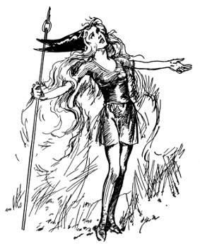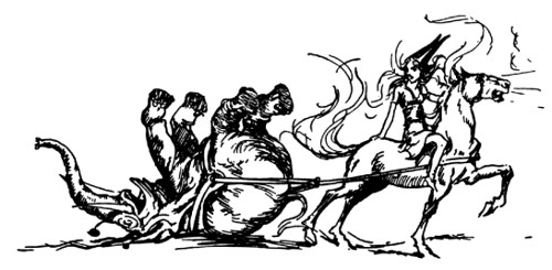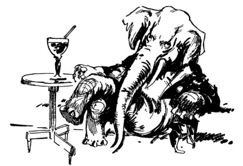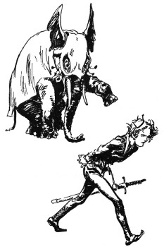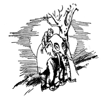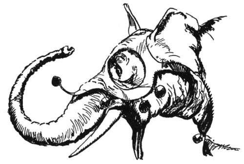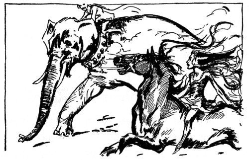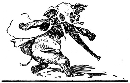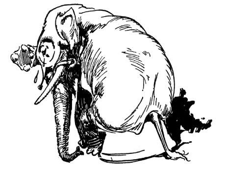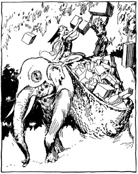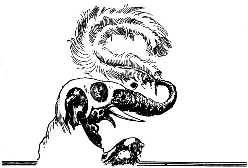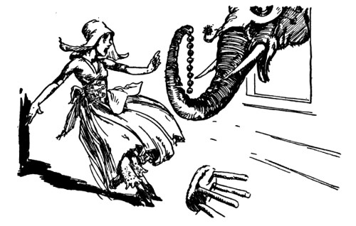 "And about time," fumed an indignant voice, as Kayub reluctantly drew the bolts and, swinging wide the doors, stepped back to let a magnificently caparisoned elephant swing through. "A fine welcome this is, I must say, for the Elegant Elephant of Oz! Out of my way, wart!" Picking Kayub up in his trunk, the visitor jammed him down hard into a golden trash barrel, trumpeted fiercely at the double line of guards who had instantly sprung to attention, and went swaying across the courtyard.