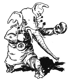 "A foot," roared the Elegant Elephant, throwing back his head. "Oh, come now, I couldn't have grown a foot without noticing it, and I still have but four—here, count 'em! Say, who in hay bales gave you that black eye?"