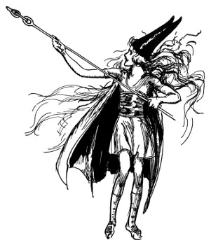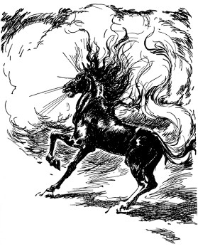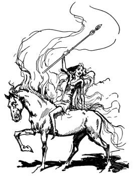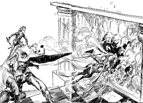 "Have I really?" Racing over to a mirror, Randy proudly examined his injured orb. "Oh, Uncle, isn't this fun? Who did it? What's up, d'ye s'pose—a revolution?" Hurrying back to the window, Randy recklessly thrust out his head to stare down into the courtyard. Kayub, the Gatekeeper, had his shoulder braced against the gold-studded doors in the castle wall, but even so, the doors were bulging and creaking from the thunderous blows struck from the other side.