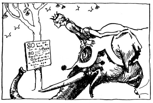 "'Tis nothing of the sort," grunted the Gatekeeper obstinately. "I looked through me little grill but a moment ago and it's no Prince at all, but a parade! A parade of one elephant, if you please, and when I orders him to the rear entrance he ups with his trunk and flings rocks over our wall!"