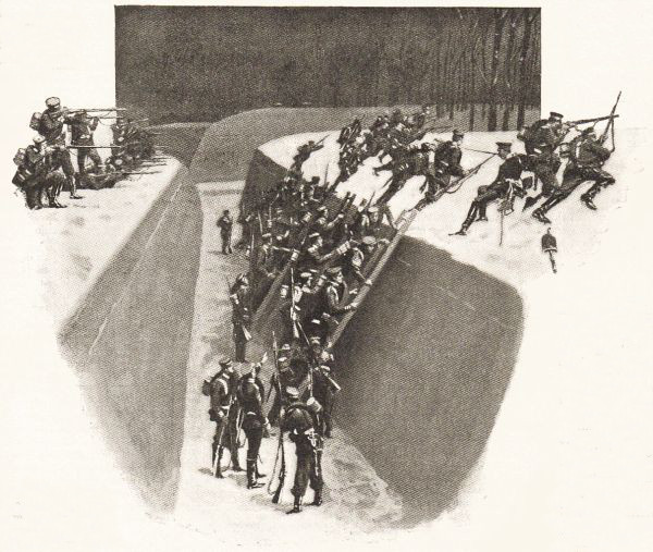 A detachment made up of several battalions of Pioneers and Grenadier Guards was sent across country on a long march during one of these manœuvres, in an attempt to surprise and capture a fortress. The attack was to be made entirely without the aid and support of artillery. The troops arrived before the fortress in the evening, and were immediately ordered to the attack, the plan being to take the place by assault. The bastions and ramparts, of course, were covered with snow, and the water in the moat, if there was any, was frozen hard. They approached as quietly as they could, with the intention of crossing the moat, but before they could get their scaling-ladders into position the garrison had been alarmed by the sentries, and immediately opened fire upon the attacking party. Search-lights were also brought into play to throw their glare into the moat, where the Grenadiers had gathered in order to climb the ramparts. But in spite of this the Guards scaled the inner defences, being protected by the Pioneers, who were drawn up on the other side of the moat, and kept up such a constant fire on the garrison that these troops were unable to prevent the approach of the Grenadiers. As soon as the latter had successfully climbed the ramparts, they in turn opened a hot fire upon the defenders, while the Pioneers crossed the moat behind them. And when the whole attacking force had thus surmounted their greatest obstacle, they made a rush over the inner defences of the fortress and captured it. This is only one of the many kinds of winter manœuvres that the German troops practise. Sometimes whole army corps are sent to capture a city or to take possession of a line of railroad; and if the snows are so heavy that these roads are impassable, the railway corps of the German army can construct a road made of light steel tracks across country over the ice and the drifts. In this way they keep up communication with their base of supplies.