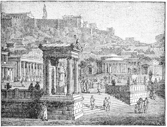 The market of Athens at a later period, about 200 B. C. (In the upper part, in the background, is the Acropolis with the Parthenon, the colossal statue of Athene, and the Propylæa. To the left of the centre is a part of King Attalus’ hall, afterwards the Stoa Poecile, the circular Tholus, and behind, the Bouleuterium. In the foreground is a statue of Eirene, Peace, with the child Plutus in her arms; in the centre of the steps the square orator’s stage with hermae at the corners.) 69