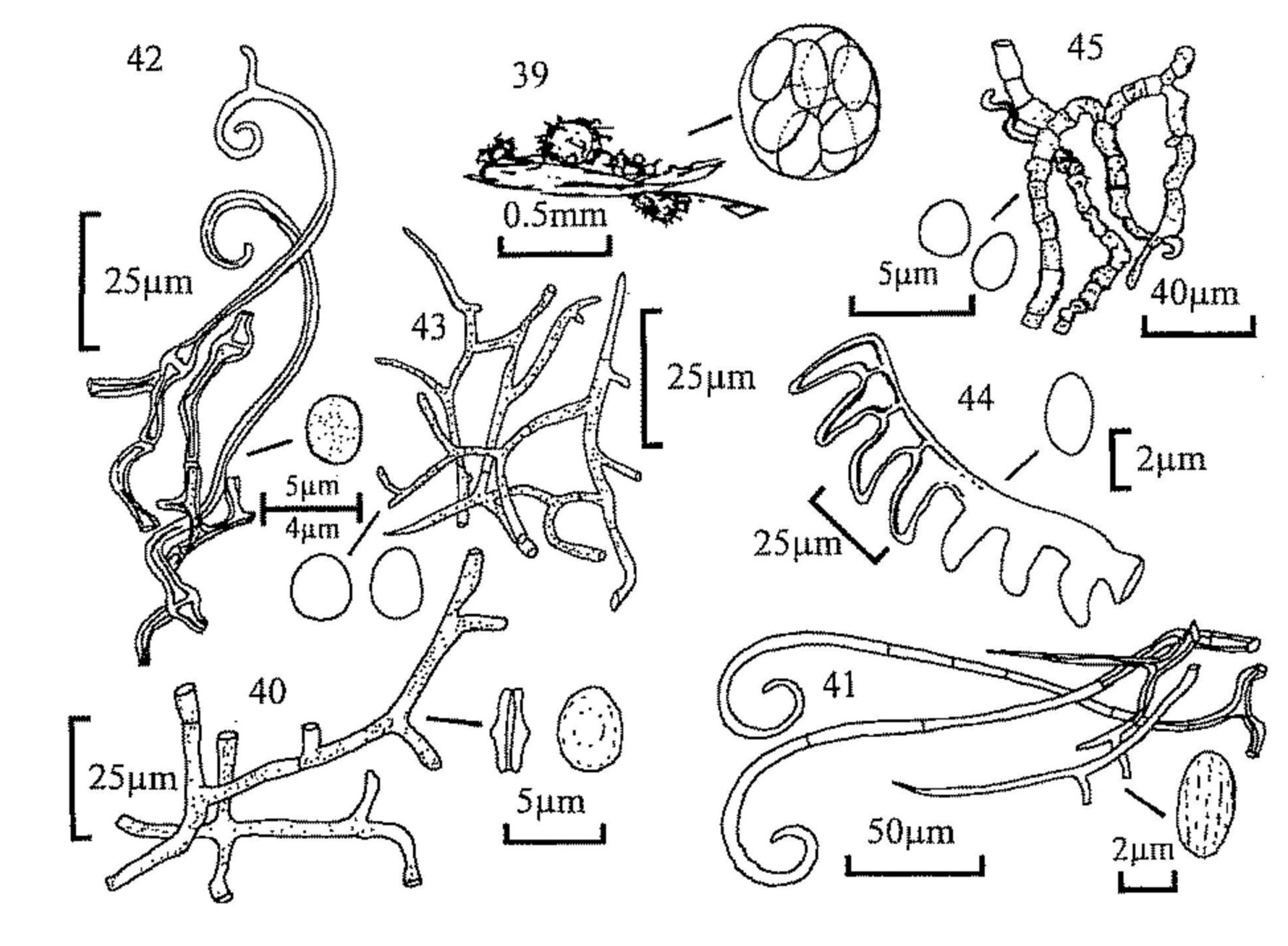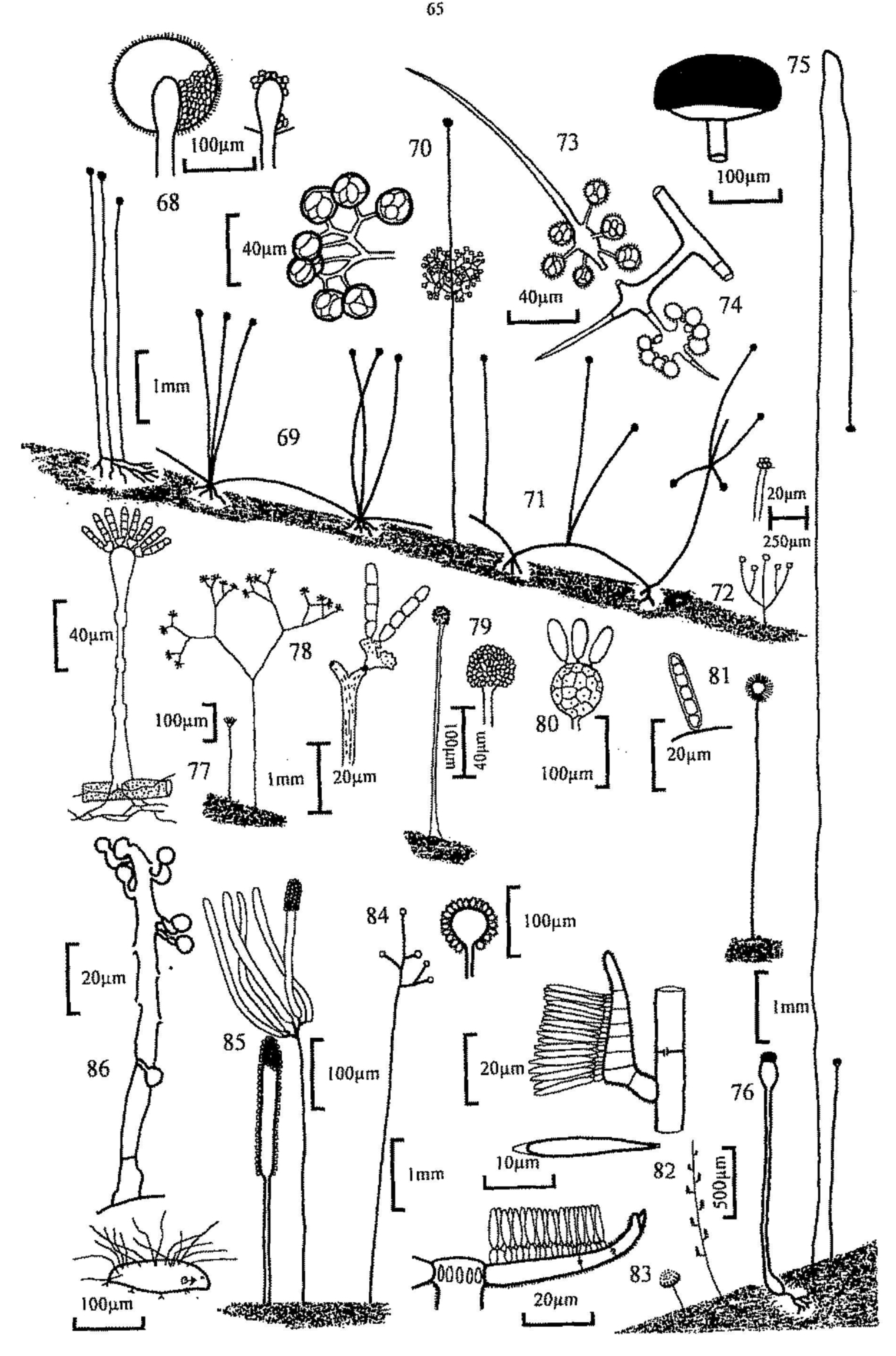 Key 4 (MJR, p. 63) is to the Zygomycota (phycomycetes) which are characteristic of dung and amongst the first to appear when freshly dropped dung is incubated. They soon disappear, however, but their fruiting can be prolonged by plating small portions of dung on a nutrient medium (e.g. potato carrot or potato dextrose agar) to which has been added a small amount of antibiotic to reduce bacterial growth. This method is especially suitable for the parasitic and predacious fungi. A cultural approach is essential for the identification of many of these fungi and the above media, and oatmeal agar, are suitable for culture as well as isolation. For this reason the study of this group of fungi is less easy than that of the ascomycetes and basidiomycetes but, because the asexual stages are characteristic, we have attempted to key out the commoner genera which might be found, with notes on common species. The asexual spores are sporangiospores formed in sporangia; some sporangia produce a single spore within a closely fitting sporangium, and have in the past been erroneously described as conidia. A great range of sporangial structure occurs within the orders concerned. The classical structure is the massive (up to 250µm diam.) multispored sporangium with an internal columella which remains after the spores have been dispersed (e.g. Mucor); those of Mortierella are similar, but smaller and without a columella. Other sporangia are much reduced and may be only 10-20µm diam., and contain only a small number of spores (Thamnidium) or one spore (Chaetocladium); these small globose structures are termed sporangioles. Spores may also form in chains; the chains are in terminal groups and are formed by the differentiation of the contents of cylindrical sporangia which are considered to be part-sporangia (merosporangia). When the sporangial wall has disappeared the spore chains may remain discrete and intact, or they may collapse into a wet droplet of spores (Syncephalastrum, some Piptocephalis). Members of the Kickxellaceae (e.g. Coemansia, Kickxella) have single spored merosporangia produced in serried ranks on boat-shaped or swollen structures (sporoclades). The sexual spores (zygospores) are rarely seen without culturing; oatmeal agar is one which favours their production. The key includes one member of the Entomophthorales, which also produces single-spored sporangia. Other members of this order may be found parasitising the various animals which live in dung; many other predacious fungi may also be seen, e.g. parasites of amoebae (Acaulopage). The key is of necessity far from complete, and omits members of the Dimargaritales, which have been found frequently on dung of small mammals in America.
