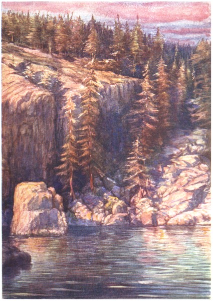 Angling in the lakes for trout is also a delightful sport. Within ten miles of St. John’s there are large expanses of water that are alive with Loch Leven and Californian rainbow trout. On a charming June morning you decide to leave the city and spend the day with rod and line upon the lakes in your little canvas boat. You see that your conveyance contains a kettle, a teapot, and a good supply of food, for when you reach the side of the lake you will find it almost impossible to satisfy your hunger. Away you start at a rattling pace, and in a short73 time you find yourself in the heart of primitive scenery. What does it matter if the trout refuse to bite? The air has given you a new lease of life, the blue sky has got into your soul, the odour of the avenues of spruce-trees makes you smack your lips, and at every turn in the road you are greeted by some stream that babbles through a cluster of ferns and flowers. Then your horse creeps panting up a steep hill, whose summit introduces you to a glimpse of the great Atlantic, or a quaint little fishing village sleeping in a cuplike hollow near the seashore. At last you reach the lake, unharness the horse, prepare your rod and line, fix your boat on the water, and lure your fish to the surface of the lake by the aid of your “Silver Doctor,” for that is the fly that seems best to tempt the palate of the “rainbow,” and “Loch Leven.” When you have whipped the water for a few hours, you suddenly get a telegraphic message from your stomach that it is time to dine. You pull up to the edge of the water, make an extempore fire-grate out of the boulders, snap off some dry spruce-twigs, and in a short time the mouth of your kettle is belching forth boiling water. The only sounds to be heard are the crackling of the burning twigs and the song of your kettle. One member of the party spreads the cloth upon the velvet moss, one makes the tea, one opens the tinned peaches, and another goes into the wood with74 a dish to gather wild raspberries, to add lusciousness to the pot of cream.